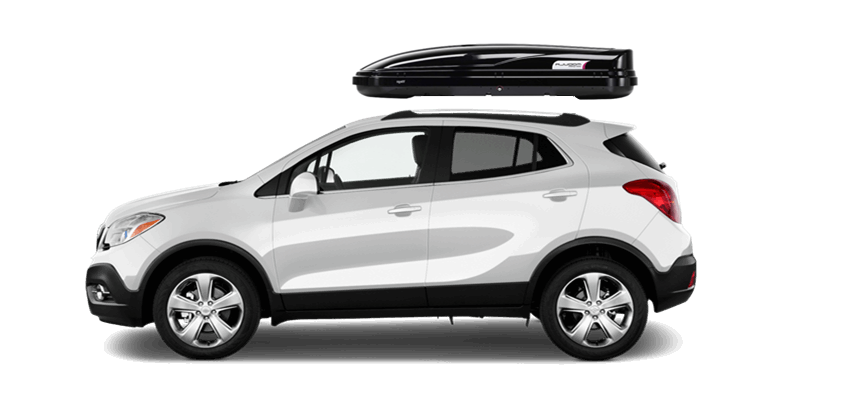 Thule Sonic XXL 636S on Buick Encore Patented AeroNose Design cuts through the air and reduces drag and noise | Patented Rear-Angled Base and expanded vehicle mounting points help maximize trunk and hatch clearance | AcuTight Mounting "clicks" when you reach optimal hold to ensure your box is secured to the rack | Oversized SecureLock ensures the box is closed securely and properly prior to driving | Dual-Side Opening for loading/unloading from either side of the vehicle