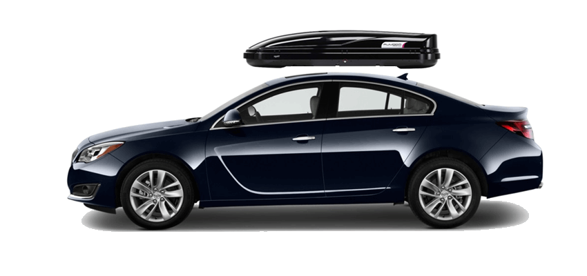 Thule Sonic Large 634B on Buick Regal Patented AeroNose Design cuts through the air and reduces drag and noise | Patented Rear-Angled Base and expanded vehicle mounting points help maximize trunk and hatch clearance | AcuTight Mounting "clicks" when you reach optimal hold to ensure your box is secured to the rack | Oversized SecureLock ensures the box is closed securely and properly prior to driving | Dual-Side Opening for loading/unloading from either side of the vehicle