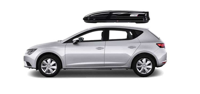 Thule Sonic XL 635S on Seat Leon Patented AeroNose Design cuts through the air and reduces drag and noise | Patented Rear-Angled Base and expanded vehicle mounting points help maximize trunk and hatch clearance | AcuTight Mounting "clicks" when you reach optimal hold to ensure your box is secured to the rack | Oversized SecureLock ensures the box is closed securely and properly prior to driving | Dual-Side Opening for loading/unloading from either side of the vehicle